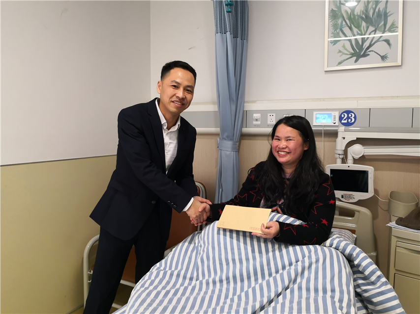 ▲王志男副校長細心詢問黃慧婷老師的病情和治療情況,鼓勵她要樹立信心,積極配合治療,爭取早日康復(fù),黃慧婷老師對育才的牽掛和慰問表示由衷的感謝。