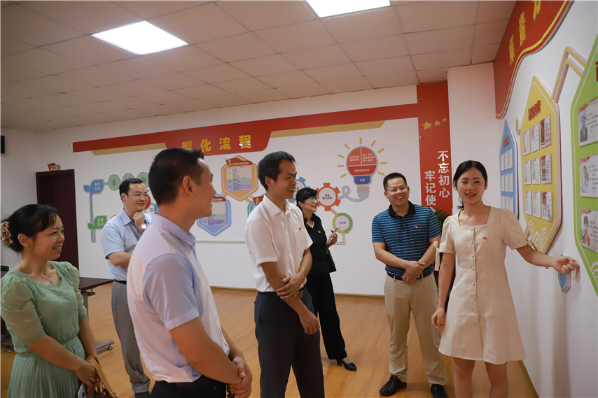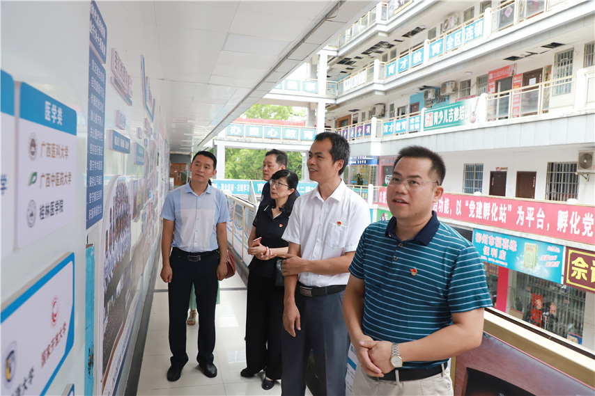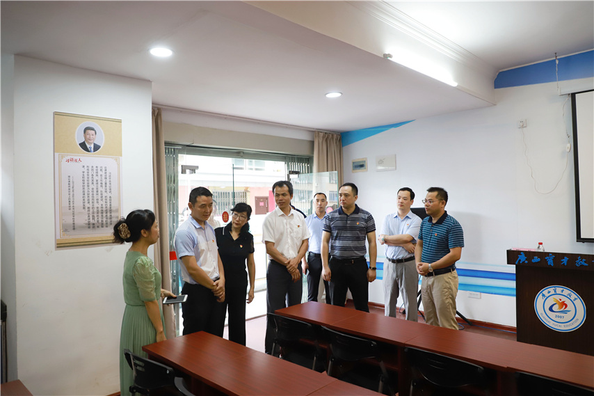 ▲廣西大學(xué)馬克思主義學(xué)院黨委書記周瑞超(中)、副處級組織員冷相宜(右三)、魚峰區(qū)委組織部副部長于俊發(fā)(左三)了解孵化站師資力量