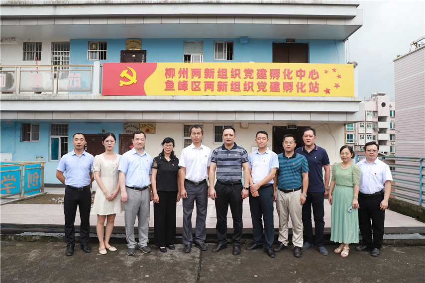▲廣西大學(xué)馬克思主義學(xué)院黨委書記周瑞超(左四)、副處級組織員冷相宜(左三)、柳州市委組織部組織四科科長池福波(右三)、魚峰區(qū)委組織部副部長于俊發(fā)(左二)參觀孵化站建設(shè)