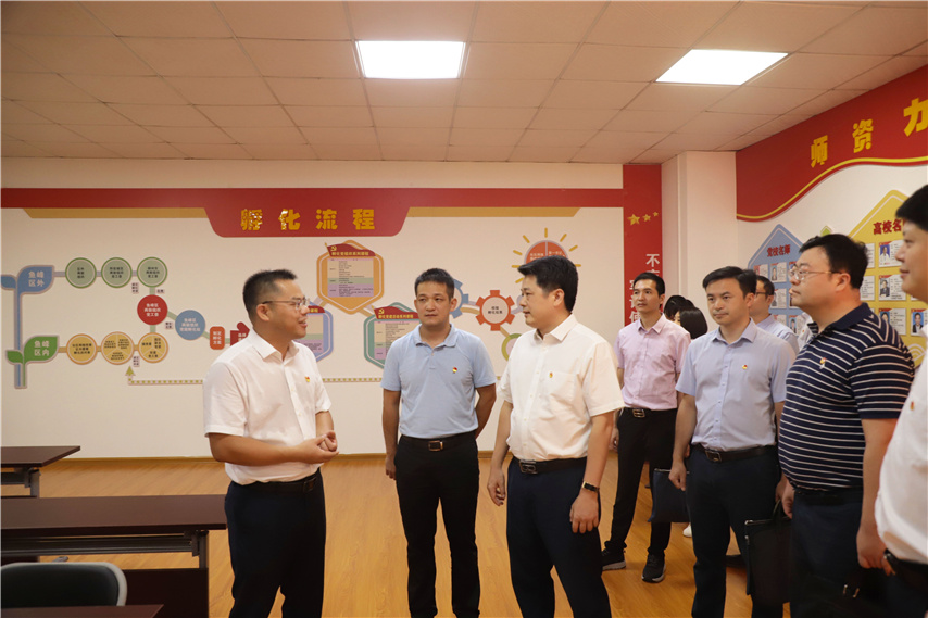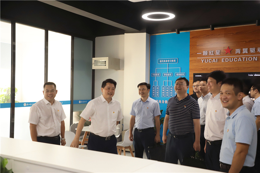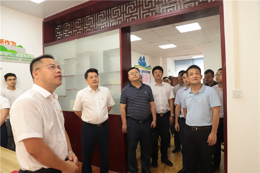 ▲團中央調(diào)研組組長、團廣西壯族自治區(qū)委書記李楚(左二),團寧夏回族自治區(qū)委副書記丁聃(左四)、團柳州市委書記張閏(前排右二)、中共魚峰區(qū)委副書記王漢強(前排右一)參觀育才辦公環(huán)境