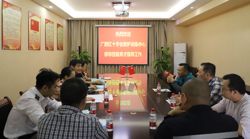 11月5日,廣西紅十?字會救護訓練中心主任?何國?杰、廣西紅十字基金會項目部部長覃超蕓、救護訓練中心主?任助?理饒斐、救?護訓?練中心柳?州工作站站長張郁?林一行蒞臨育才考察指導,集團聯(lián)合黨委書記、董事長蔣華,聯(lián)合黨委委員、培訓學院副院長趙彬陪同考察座談。