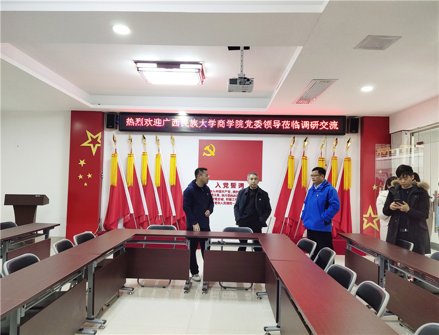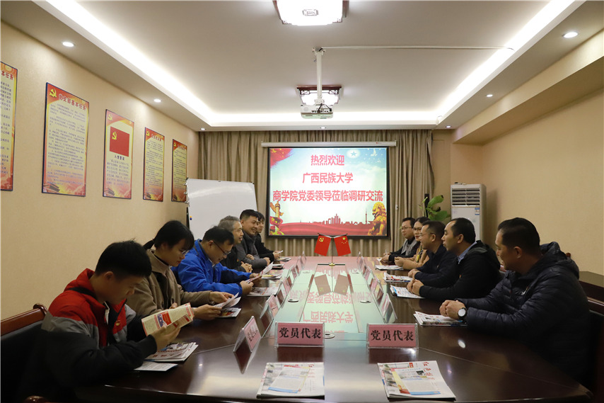 12月19日,廣西民族大學(xué)商學(xué)院黨委書記李華明,副書記曾令發(fā)、副院長(zhǎng)高文濤、學(xué)生黨支部書記楊玉及四名學(xué)生黨員一行蒞臨集團(tuán)柳?州本部調(diào)研交?流黨建工作,集團(tuán)聯(lián)合黨委黨書記、董事長(zhǎng)蔣華,聯(lián)合黨委紀(jì)檢委員、副校長(zhǎng)李彩梅,聯(lián)合黨委委員、副校長(zhǎng)蔣亮,聯(lián)合黨委委員、培訓(xùn)學(xué)院副院長(zhǎng)趙彬陪同交流。