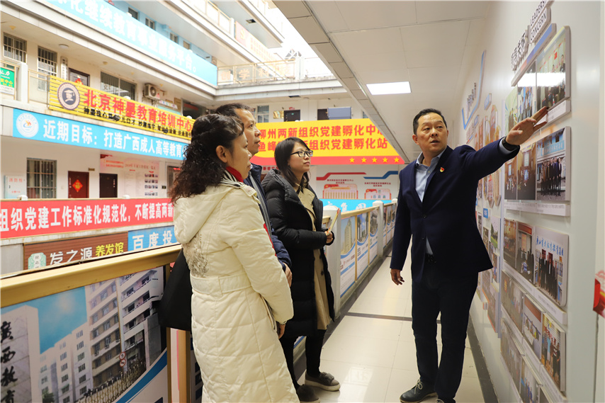 1月14日,桂林市委組織部部務會成員、兩新組織黨工委專職副書記陳薇薇,桂林市委組織部組織四科副科長詹繼祥一行5人蒞臨柳州市兩新組織黨建孵化中心和魚峰區(qū)兩新組織黨建孵化站座談交流,柳州市委組織部組織五科科長陸軍,魚峰區(qū)兩新組織黨工委副書記莫祥芬,集團聯合黨委委員、孵化站辦公室主任、培訓學院副院長趙彬陪同座談交流。