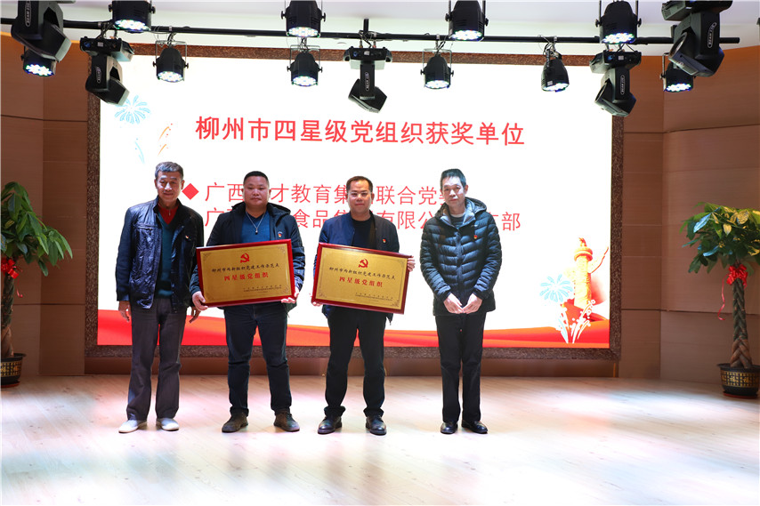 ▲集團(tuán)黨委書記蔣華(右二)領(lǐng)取柳州市“四星級(jí)黨組織”榮譽(yù)獎(jiǎng)牌