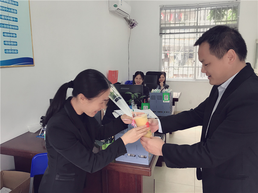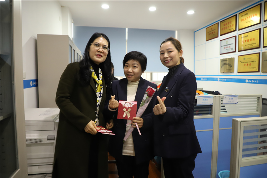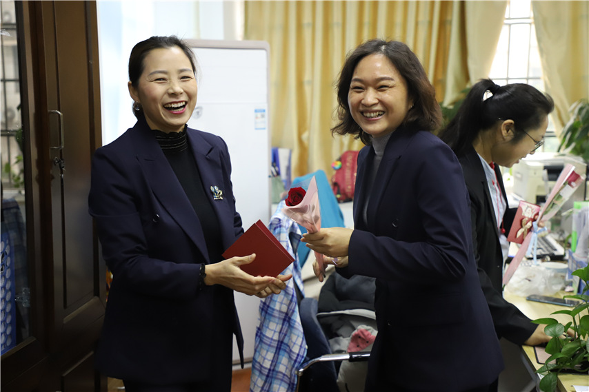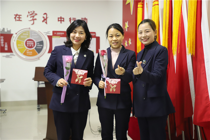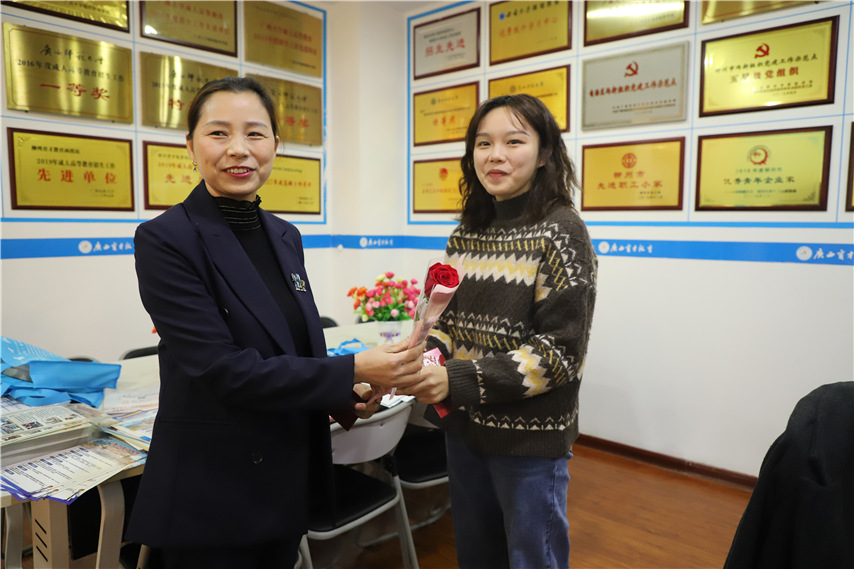 ▲柳州本部(集團(tuán)黨委委員、副總經(jīng)理、副校長李彩梅,集團(tuán)黨委委員、工會主席、副總經(jīng)理、副校長王麗為女職工贈送玫瑰花)