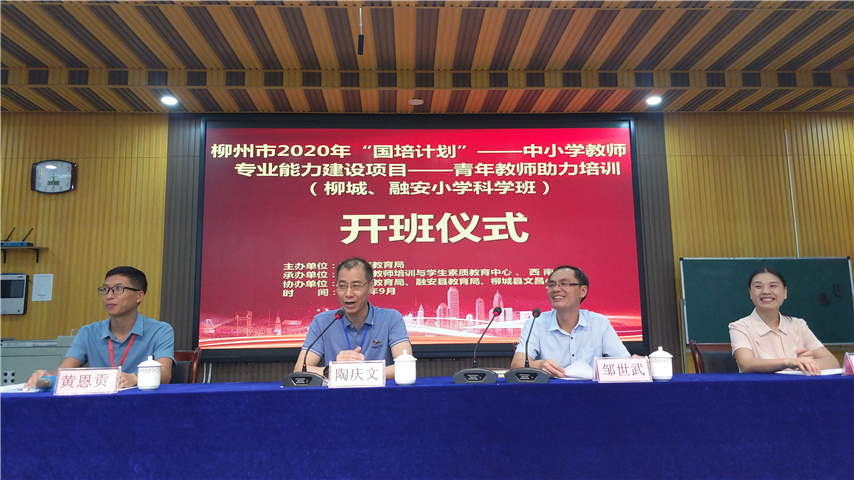 9月14日???,2020年???“???國(guó)???????培???計(jì)???劃???”???市???????級(jí)???統(tǒng)???????籌??青???年???教???師???助???力???培???訓(xùn)???(柳城縣、融安縣小學(xué)科學(xué)班???)在柳城縣順利開(kāi)???????班???,???柳州市教師培訓(xùn)與學(xué)生素質(zhì)教育中心陶慶文主任出???席???開(kāi)???班???儀???式???并?做?講?話?,?來(lái)?自?柳城縣、融安縣?初中?的50???余名???老???????師???參???????加???了此次?培訓(xùn)?。