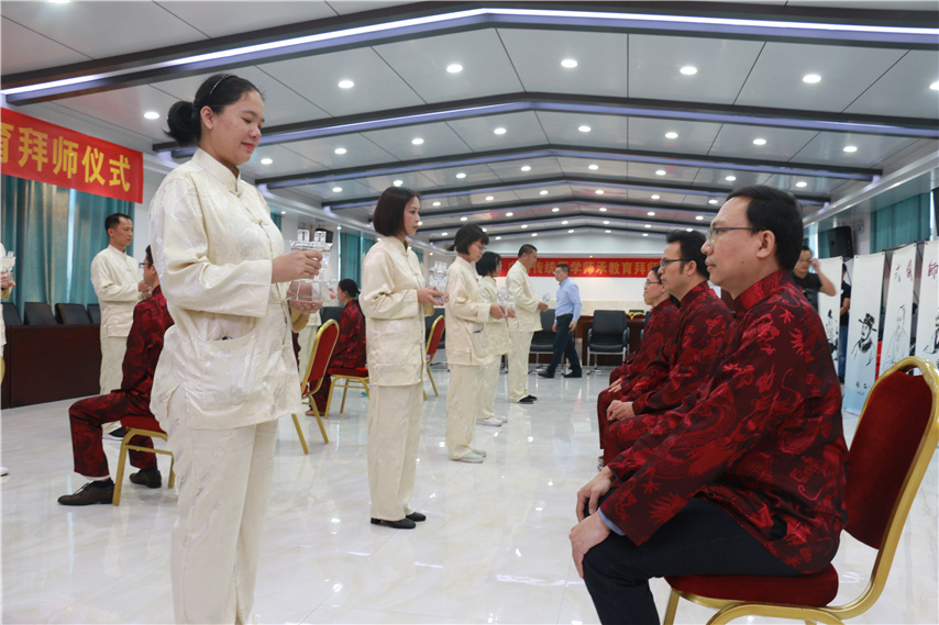 ▲學(xué)生向老師呈拜師禮(水晶方鼎)