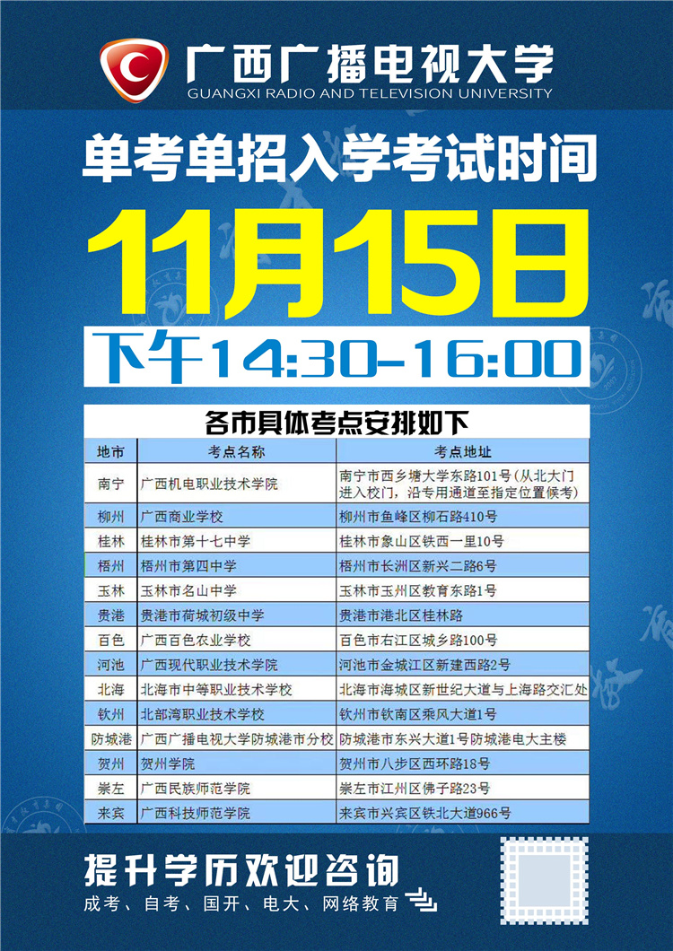 11月15日舉行廣西廣播電視大學單考單招入學考試