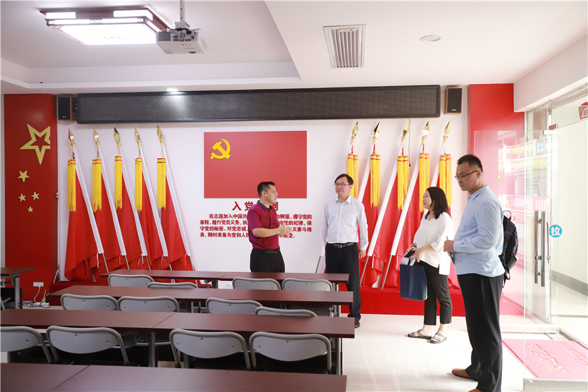 ▲王長(zhǎng)明先生(右一)參觀育才柳州本部辦公環(huán)境