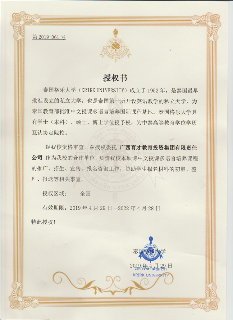 ▲泰國(guó)格樂大學(xué)授權(quán)書