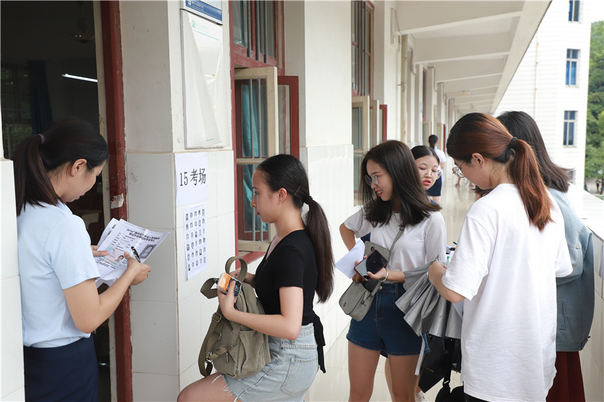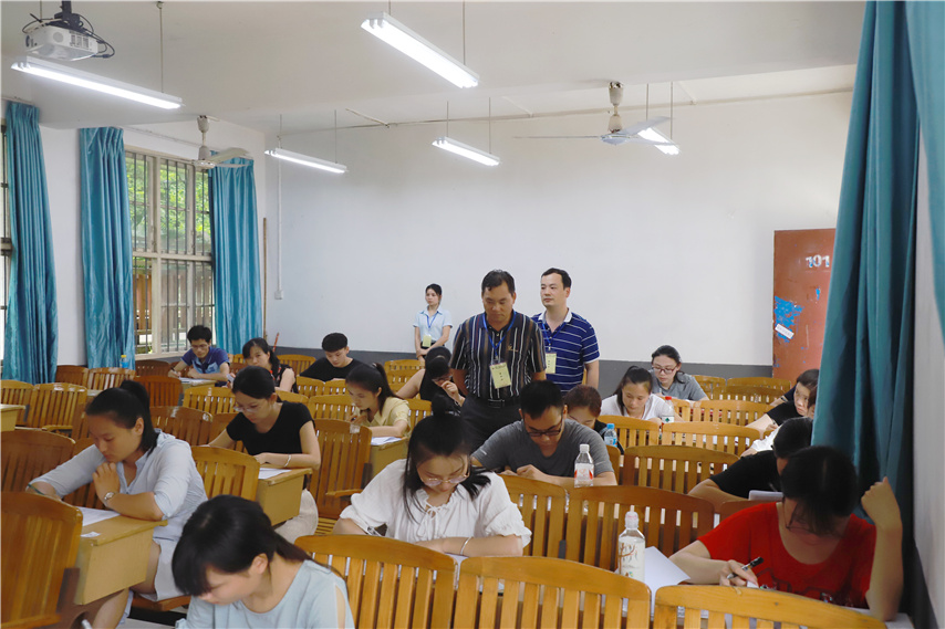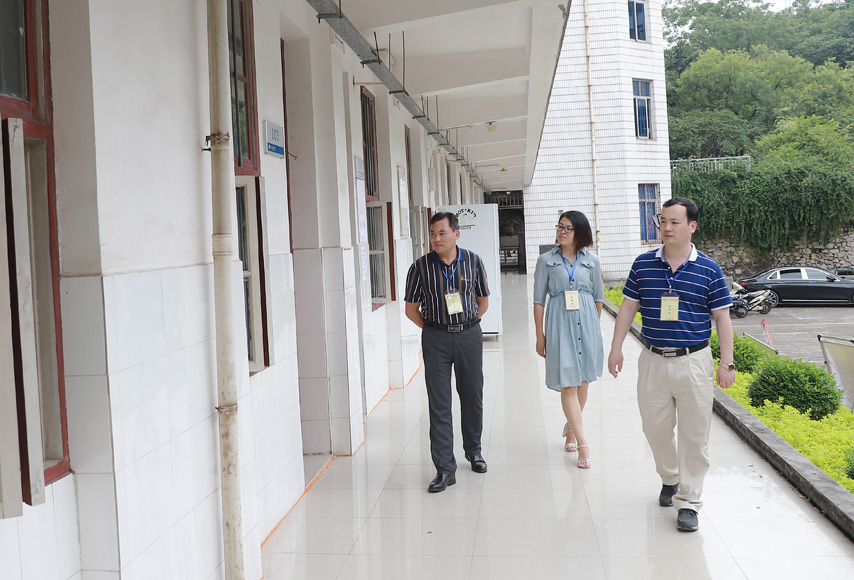 ▲廣西師范大學(xué)繼續(xù)教育學(xué)院副院長(zhǎng)蔣冬青(左一)到柳州考點(diǎn)巡考