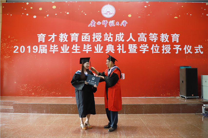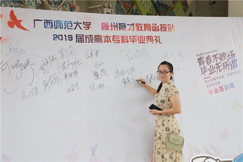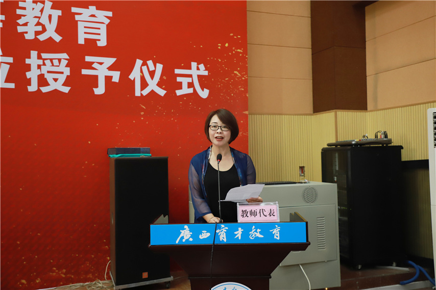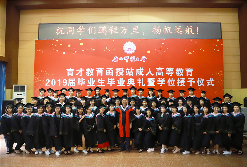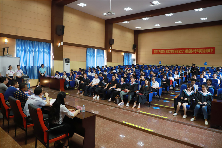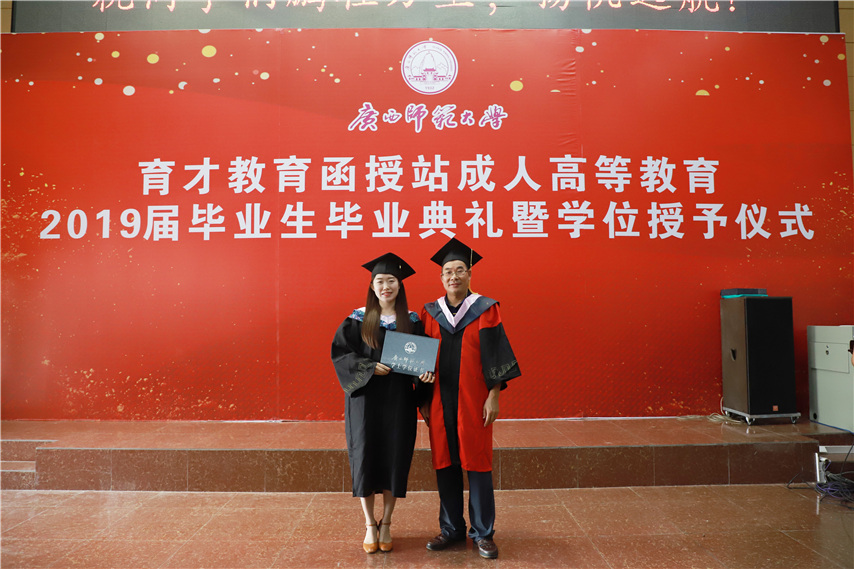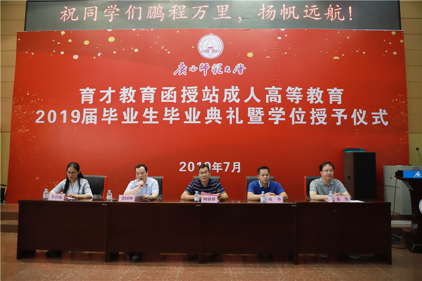 函授站站長(zhǎng)蔣華老師用十個(gè)字概況了自己的講話,一是祝賀,祝賀2019屆畢業(yè)生順利畢業(yè);二是感謝,感謝廣西師范大學(xué)送教上門;三是感恩,常懷一顆感恩的心,關(guān)心和支持廣西師范大學(xué)的發(fā)展;四是提醒,提醒畢業(yè)生妥善保管好畢業(yè)證和畢業(yè)生檔案;五是歡迎,歡迎專科的同學(xué)繼續(xù)報(bào)讀本科學(xué)歷。