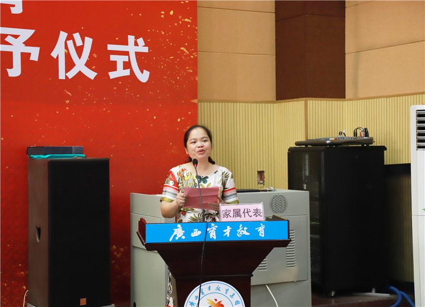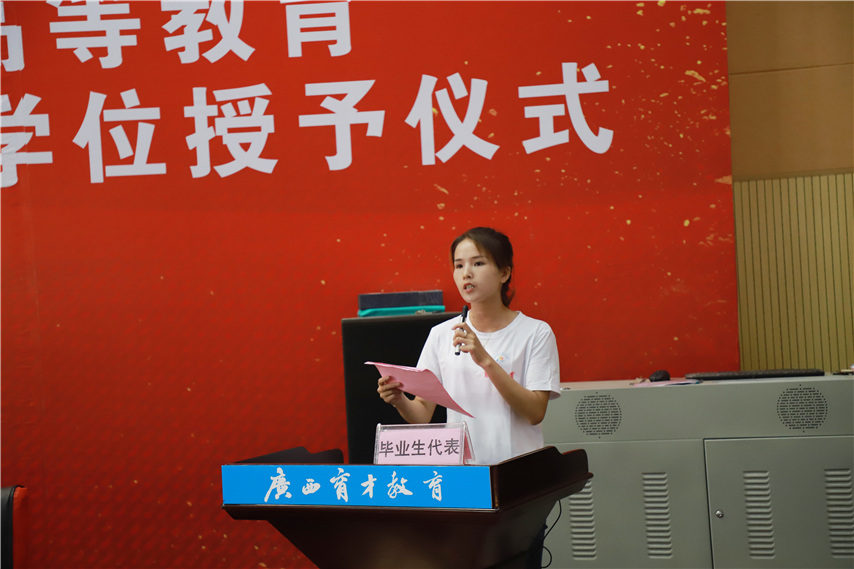 來(lái)自三江縣同樂(lè)鄉(xiāng)的吳鳳云同學(xué)作為畢業(yè)生代表發(fā)言,吳鳳云同學(xué)去年家中遭受嚴(yán)重火災(zāi),在得知吳鳳云同學(xué)的遭遇后,函授站的老師和同學(xué)們的都積極伸出援手,幫助吳風(fēng)云同學(xué)重建家園。今日的發(fā)言重現(xiàn)當(dāng)時(shí)人員受傷和家庭的困難,每一句都重新?lián)軇?dòng)在座者的心弦。