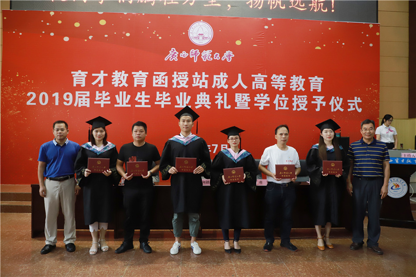 7月20日上午,廣西師范大學(xué)育才教育函授站成人高等教育2019屆畢業(yè)生畢業(yè)典禮暨學(xué)位授予儀式在柳州本部隆重舉行。廣西師范大學(xué)繼續(xù)教育學(xué)院副院長(zhǎng)何創(chuàng)雄、學(xué)歷部主任蘇華、集團(tuán)聯(lián)合黨委書記、董事長(zhǎng)、函授站站長(zhǎng)蔣華、集團(tuán)總校校長(zhǎng)梁國(guó)坤以及120余名畢業(yè)生代表參加了畢業(yè)典禮,典禮由梁國(guó)坤校長(zhǎng)主持。