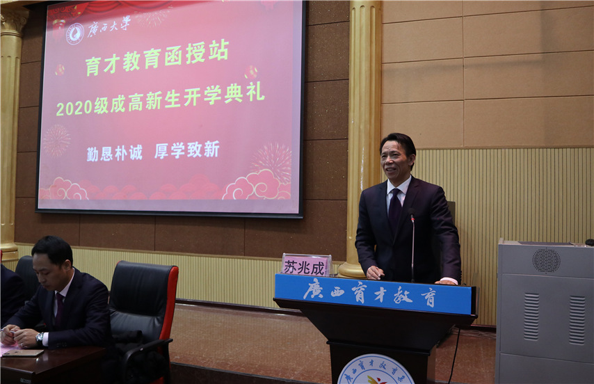 廣西大學(xué)繼續(xù)教育學(xué)院院長蘇兆成代表學(xué)校向2020級的全體新生的錄取表示熱烈的祝賀,蘇院長介紹了廣西大學(xué)悠久的發(fā)展歷史、雄厚的師資隊伍建設(shè)等優(yōu)勢以及近年所取得的成績,他與全體新生分享了四個求學(xué)的問題:一是學(xué)不學(xué)?二是學(xué)什么?三是怎么學(xué)?四是去哪里學(xué)?為全體新生上好了開學(xué)第一課,勉勵全體新生要適應(yīng)成人高等教育的教學(xué)方式和方法,合理安排好學(xué)習(xí)時間、提高學(xué)習(xí)效率,學(xué)有所成,全面提高德商、智商和情商,在適應(yīng)社會發(fā)展需要的同時,成就自己的事業(yè)夢想。