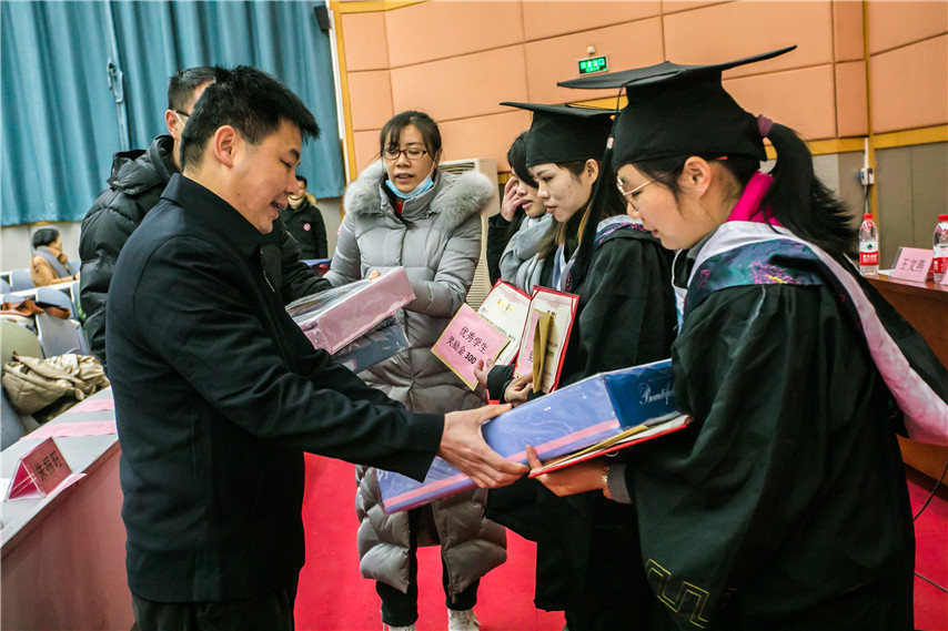 ▲領(lǐng)導(dǎo)為畢業(yè)生代表頒發(fā)畢業(yè)證書、學(xué)位證書,為在新冠肺炎疫情防控工作中表現(xiàn)突出的2021屆優(yōu)秀畢業(yè)生代表頒發(fā)榮譽(yù)證書和獎金、慰問品