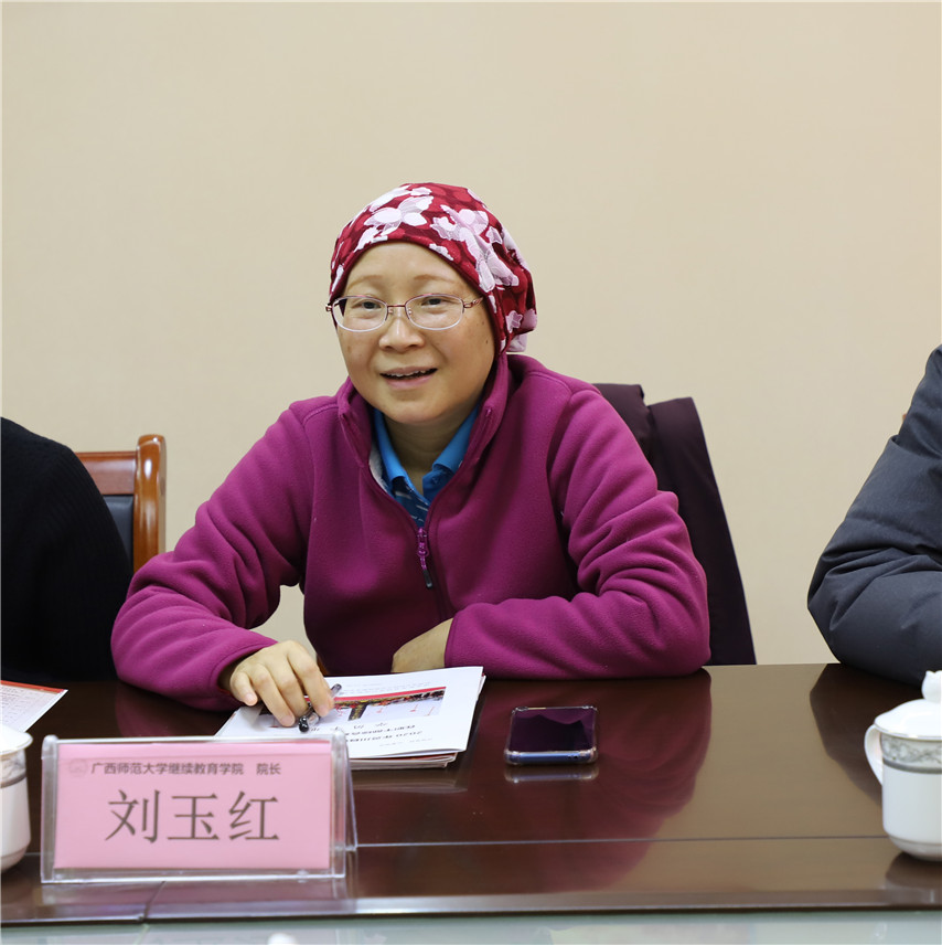 ▲廣西師范大學繼續(xù)教育學院院長、博士生導師劉玉紅教授座談交流