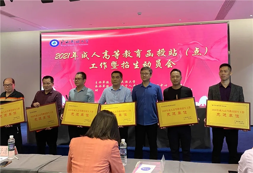 會(huì)上,領(lǐng)導(dǎo)們?yōu)楂@得表彰的函授站(教學(xué)點(diǎn))頒發(fā)招生工作先進(jìn)單位榮譽(yù)牌匾,因工作出色,我函授站榮獲廣西民族大學(xué)2020年成人高等教育招生工作“先進(jìn)單位”,這也是集團(tuán)與廣西民族大學(xué)合作辦學(xué)以來連續(xù)3年榮獲廣西民族大學(xué)成人高等教育招生工作“先進(jìn)單位”。
