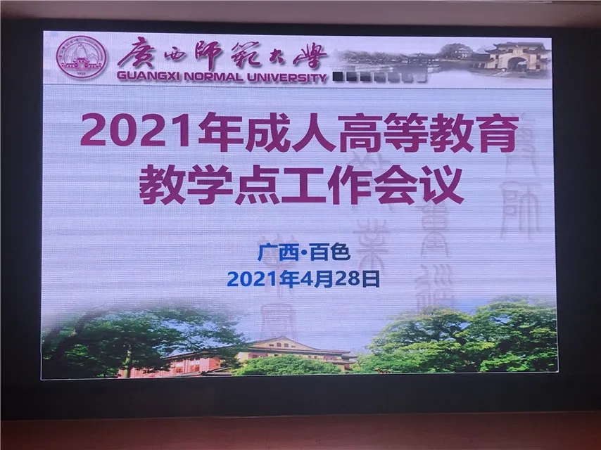 4月28日,廣西師范大學2021年成人高等教育教學點工作會議在百色順利召開,繼續(xù)教育學院院長、博士生導師劉玉紅教授、副院長何創(chuàng)雄、謝俊峰、李敏以及各成高教學點負責人共60余人參加了會議,會議由李敏副院長主持,我函授站站長蔣華參加了會議。