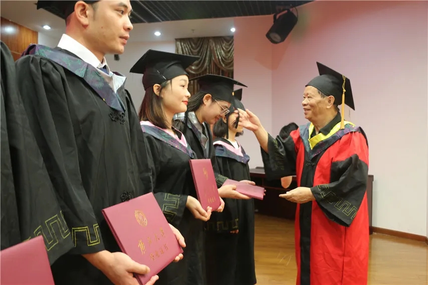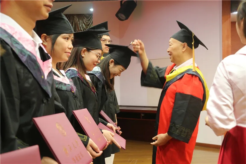 ▲梁國(guó)坤校長(zhǎng)為獲得學(xué)士學(xué)位的畢業(yè)生代表?yè)芩胝趫?zhí)“撥穗禮”,頒發(fā)學(xué)位證書(shū)