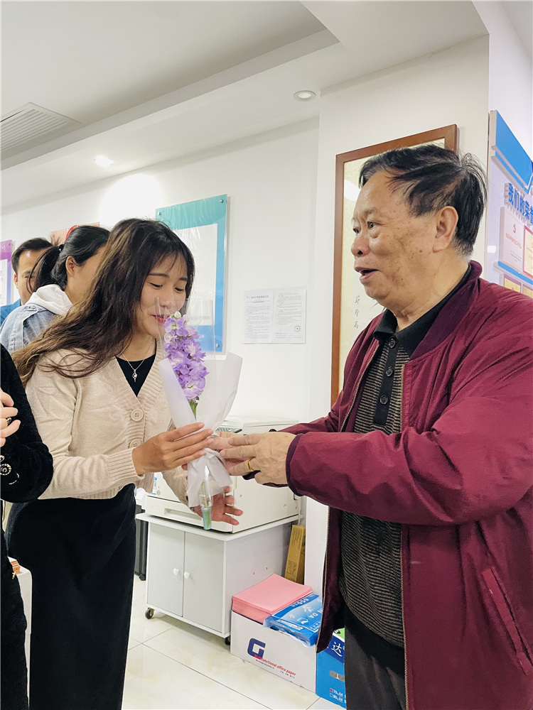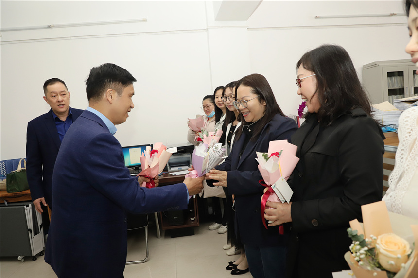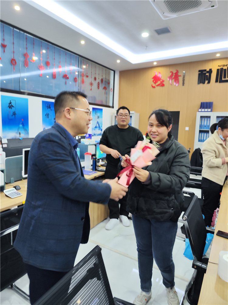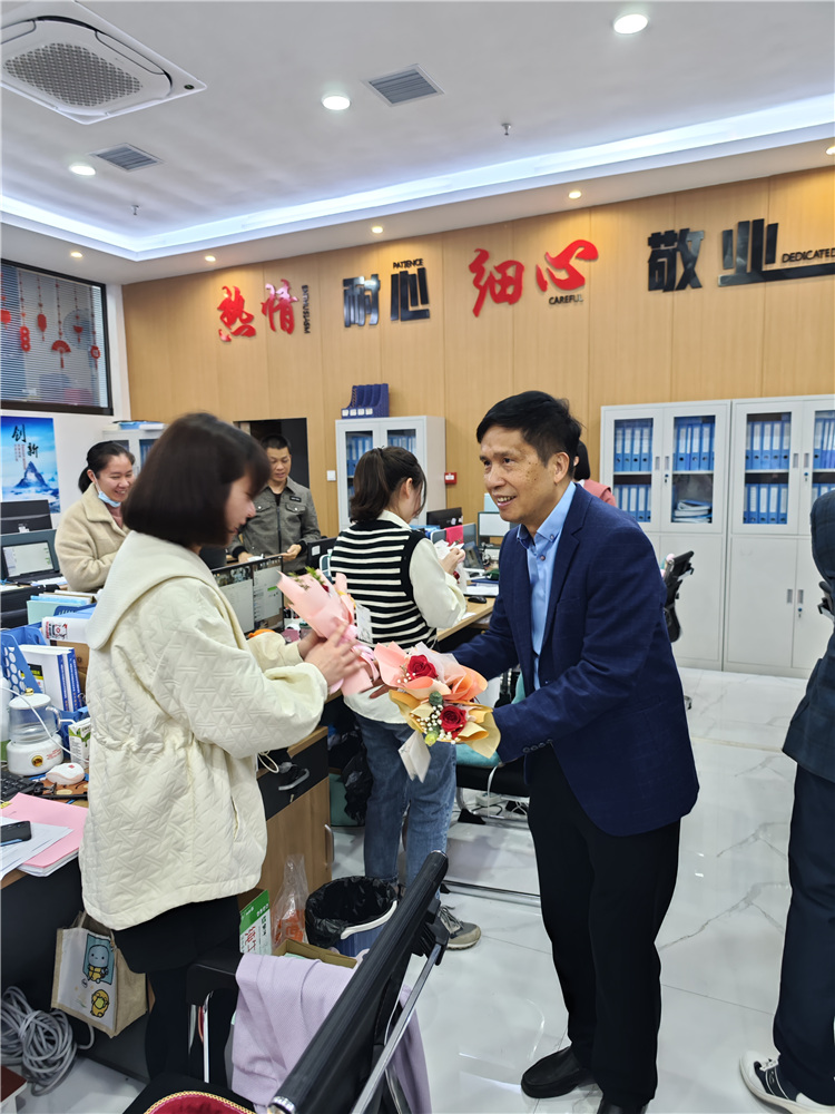 ▲市委組織部派駐集團(tuán)第一書記冼慶榮為女職工送鮮花