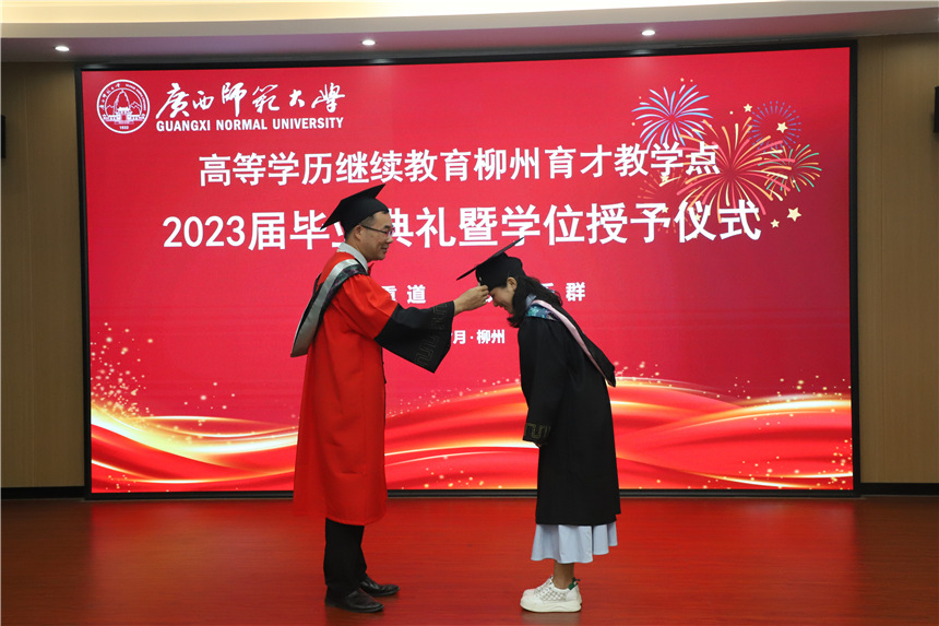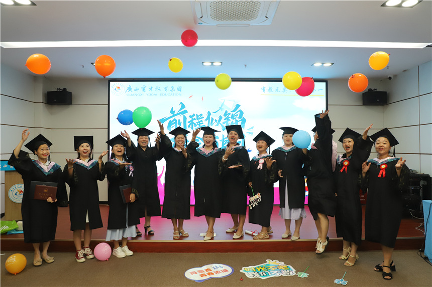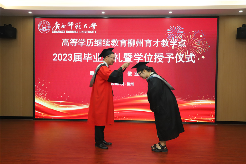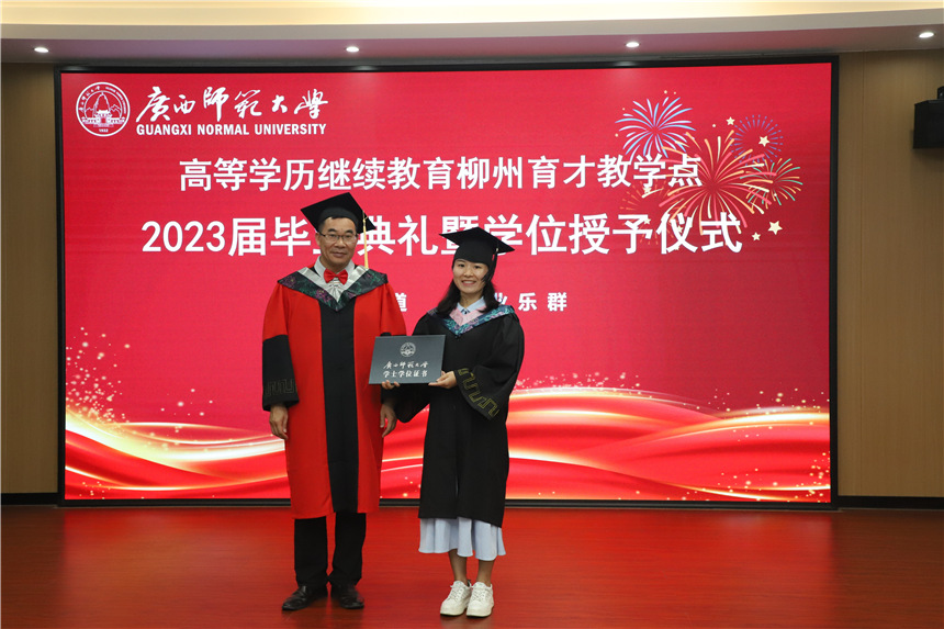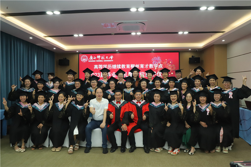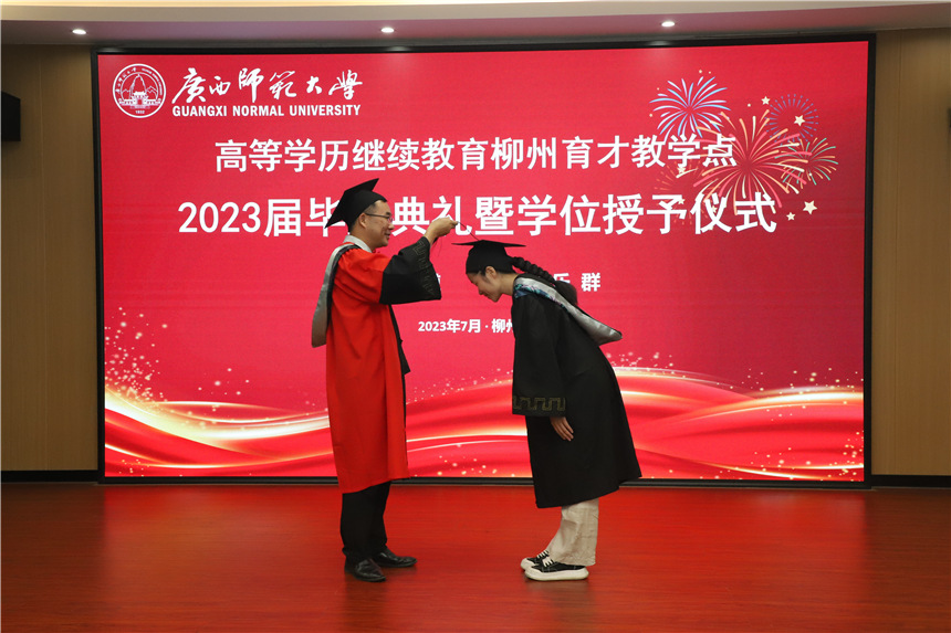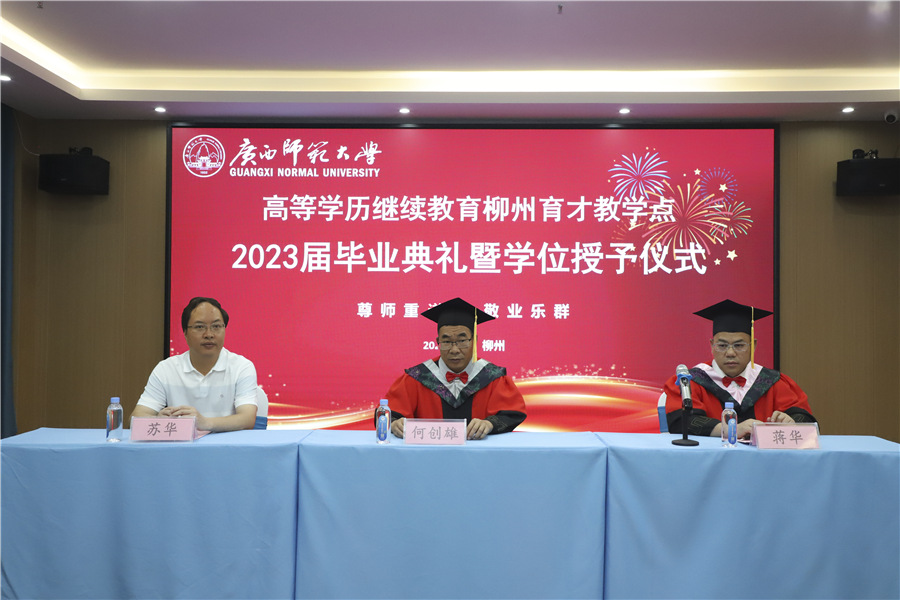 7月9日上午,廣西師范大學(xué)高等學(xué)歷繼續(xù)教育柳州育才教學(xué)點2023屆畢業(yè)典禮暨學(xué)位授予儀式在集團(tuán)屏山校區(qū)隆重舉行,廣西師范大學(xué)繼續(xù)教育學(xué)院副院長何創(chuàng)雄、院長助理蘇華,集團(tuán)黨委書記、董事長、教學(xué)點負(fù)責(zé)人蔣華、副校長李彩梅以及140余名畢業(yè)生代表參加了典禮。