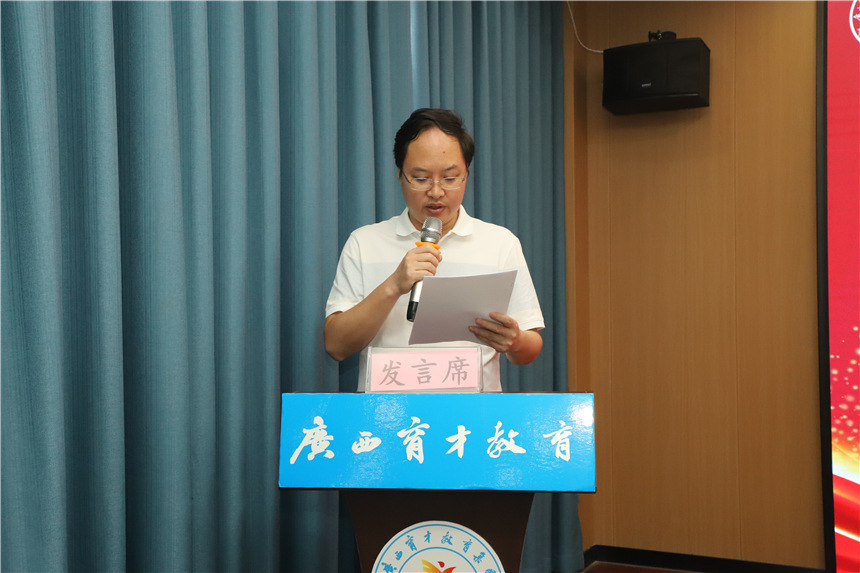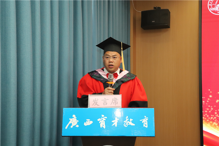 集團(tuán)黨委書記、董事長、教學(xué)點負(fù)責(zé)人蔣華代表育才全體老師對何創(chuàng)雄副院長一行百忙之中抽空參加畢業(yè)典禮表示熱烈的歡迎,對我教學(xué)點2023屆1725名畢業(yè)生順利畢業(yè)表示衷心的祝賀。他對當(dāng)前國際國內(nèi)形勢進(jìn)行了簡要分析,希望同學(xué)們自覺地把個人的理想和祖國的命運緊緊聯(lián)系在一起,把個人的志向與民族的振興緊緊聯(lián)系在一起。感謝廣西師范大學(xué)送教上門,大家在家門口就能完成學(xué)業(yè);感謝教學(xué)點的管理老師和班主任辛勤勞動,感謝大家付出艱辛汗水出色地完成學(xué)業(yè),感謝在學(xué)習(xí)的前行路上陪伴自己的家人。