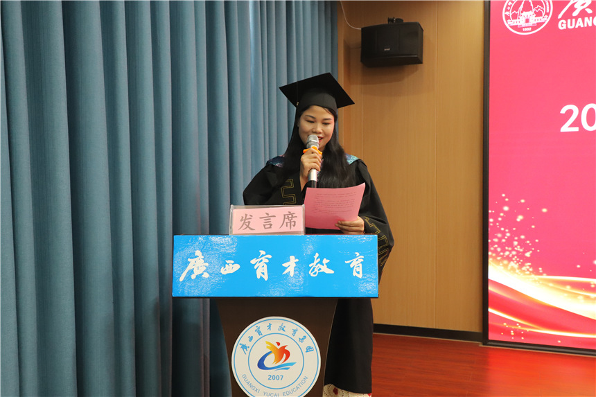 廣西師范大學(xué)繼續(xù)教育學(xué)院副院長何創(chuàng)雄向所有2023屆圓滿完成學(xué)業(yè)的同學(xué)們表示祝賀,何創(chuàng)雄副院長和同學(xué)們回顧了學(xué)校的辦學(xué)歷史,介紹了學(xué)校的辦學(xué)成就和發(fā)展思路,同時也肯定了育才教學(xué)點的辦學(xué)條件和學(xué)生規(guī)模,對教學(xué)點所取得的成績表示贊賞,希望大家無論走到何處,都能常回母??纯?。最后,他送給同學(xué)們?nèi)洚厴I(yè)贈言:一是要終身學(xué)習(xí),追求真理。追求真理,需要勇氣和毅力,需要高度獨立思考和創(chuàng)新的精神和能力,需要終身的學(xué)習(xí)。二是要艱苦創(chuàng)業(yè),自強(qiáng)不息。發(fā)揚“尊師重道 敬業(yè)樂群”的校訓(xùn)精神,以知識、毅力和情操塑造自己,完善自己,艱苦創(chuàng)業(yè),自強(qiáng)不息。三是要海納百川,有容乃大。要擁有豁達(dá)的心態(tài),直面人生的高潮和低谷。