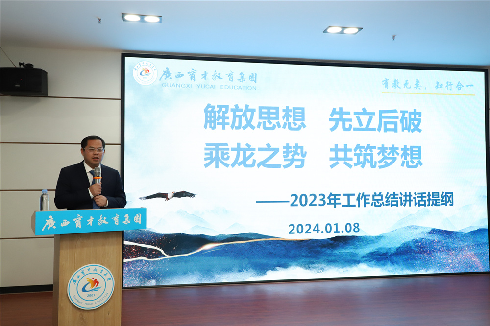 集團(tuán)黨委書(shū)記、董事長(zhǎng)蔣華以《解放思想 先立后破 乘龍之勢(shì) 共筑夢(mèng)想》為題作2023年工作總結(jié)講話。他介紹了集團(tuán)目前的基本情況和黨建工作,回顧了2023年各項(xiàng)業(yè)務(wù)工作完成情況,從學(xué)歷繼續(xù)教育、非學(xué)歷培訓(xùn)、研學(xué)旅行、教務(wù)教學(xué)、企業(yè)文化、財(cái)務(wù)結(jié)算、獲得的榮譽(yù)和不足之處等八個(gè)方面總結(jié)了各項(xiàng)工作的主要做法和亮點(diǎn),對(duì)2024年重點(diǎn)工作進(jìn)行了部署。最后寄語(yǔ)全體職工:山高萬(wàn)仞 只登一步 先立后破 穩(wěn)扎穩(wěn)打 持之以恒 精進(jìn)不休 逾躍龍門(mén) 共筑夢(mèng)想。