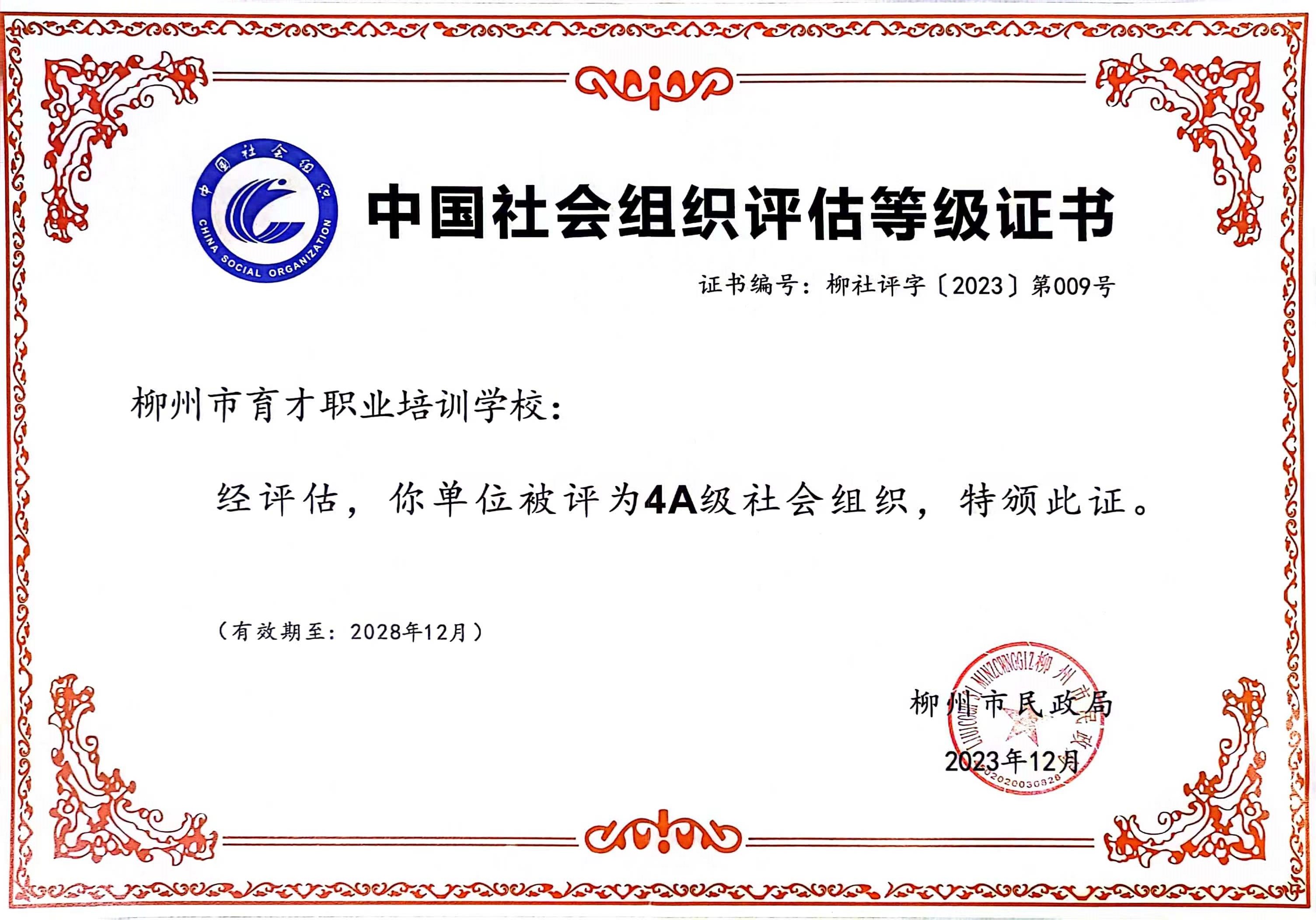 4月28日上午,柳州市2024年度社會(huì)組織等級(jí)評(píng)估動(dòng)員培訓(xùn)會(huì)在柳州市民政局順利召開(kāi),會(huì)議部署了2024年社會(huì)組織等級(jí)評(píng)估工作并向2023年度獲得3A級(jí)及以上等級(jí)的社會(huì)組織頒發(fā)牌匾和證書(shū),柳州市育才職業(yè)培訓(xùn)學(xué)校獲評(píng)柳州市“4A級(jí)”社會(huì)組織。