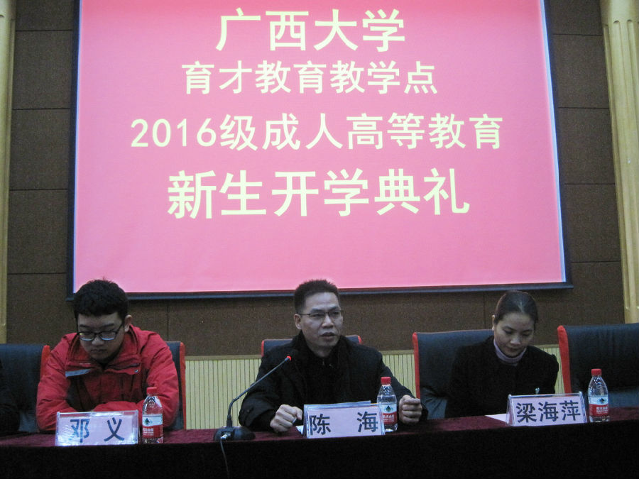 “我向成人高等教育2016級(jí)新生表示誠(chéng)摯的歡迎!你們所選擇的廣西大學(xué),是廣西唯一的國(guó)家“211工程”建設(shè)高校,是我國(guó)重點(diǎn)建設(shè)的100所大學(xué)之一,是一所有著八十多年辦學(xué)歷史的大學(xué),她有著輝煌燦爛的過(guò)去、激動(dòng)人心的今天和充滿希望的未來(lái)。廣西大學(xué)不會(huì)使你們失望,相信你們也不會(huì)讓廣西大學(xué)失望!”,陳海副院長(zhǎng)在典禮上給同學(xué)們?cè)敿?xì)介紹了廣西大學(xué)的情況,并向同學(xué)們提出了三點(diǎn)希望:一是要樹(shù)立終身學(xué)習(xí)的理念,學(xué)會(huì)自主學(xué)習(xí);二是要有堅(jiān)持不懈的恒心,學(xué)會(huì)排除萬(wàn)難;三是要積極參加社會(huì)實(shí)踐,提高綜合素養(yǎng)?!巴瑢W(xué)們,美麗的西大張開(kāi)雙臂歡迎各位新同學(xué),相信你們一定會(huì)秉承“勤懇樸誠(chéng)、厚學(xué)致新”的校訓(xùn),胸懷祖國(guó),勇于擔(dān)當(dāng),要勤學(xué)奮進(jìn),銳意創(chuàng)新,追求卓越,虛心從善,樹(shù)德修身。希望同學(xué)們牢記自己的歷史使命,努力學(xué)習(xí),奮發(fā)向上,把自己塑造成適應(yīng)時(shí)代發(fā)展需要的優(yōu)秀人才,共同書(shū)寫(xiě)人生的新篇章,書(shū)寫(xiě)廣西大學(xué)的新篇章,向家人、向母校、向社會(huì)交上滿意的答卷,為民族的振興、國(guó)家的發(fā)展作出應(yīng)有的貢獻(xiàn)。”陳海副院長(zhǎng)的話令同學(xué)們深受鼓舞,受益匪淺。