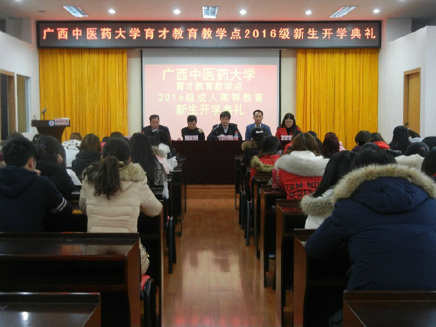 又是一年春草綠,又是一年花盛開。懷揣新的希望和夢想,2016年1月23日上午10:00,廣西中醫(yī)藥大學(xué)育才教育教學(xué)點2016級成人高等教育新生開學(xué)典禮在柳州市中醫(yī)院隆重舉行。廣西中醫(yī)藥大學(xué)成教院韋艾凌院長、黃瑞誠副院長出席了開學(xué)典禮,韋艾凌院長作了重要講話。廣西育才教育集團(tuán)董事長、廣西中醫(yī)藥大學(xué)育才教育教學(xué)點負(fù)責(zé)人蔣華老師,育才教育王志校長、李彩梅副校長以及來自柳州各大醫(yī)院、衛(wèi)生院、醫(yī)藥公司和藥店等200多名新生共同參加了開學(xué)典禮,典禮由廣西中醫(yī)藥大學(xué)成教院黃瑞誠副院長主持。