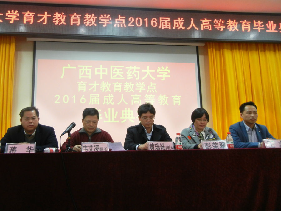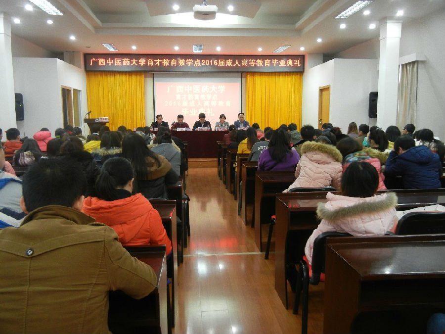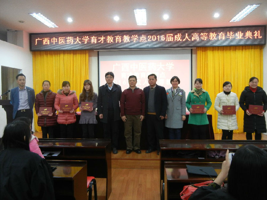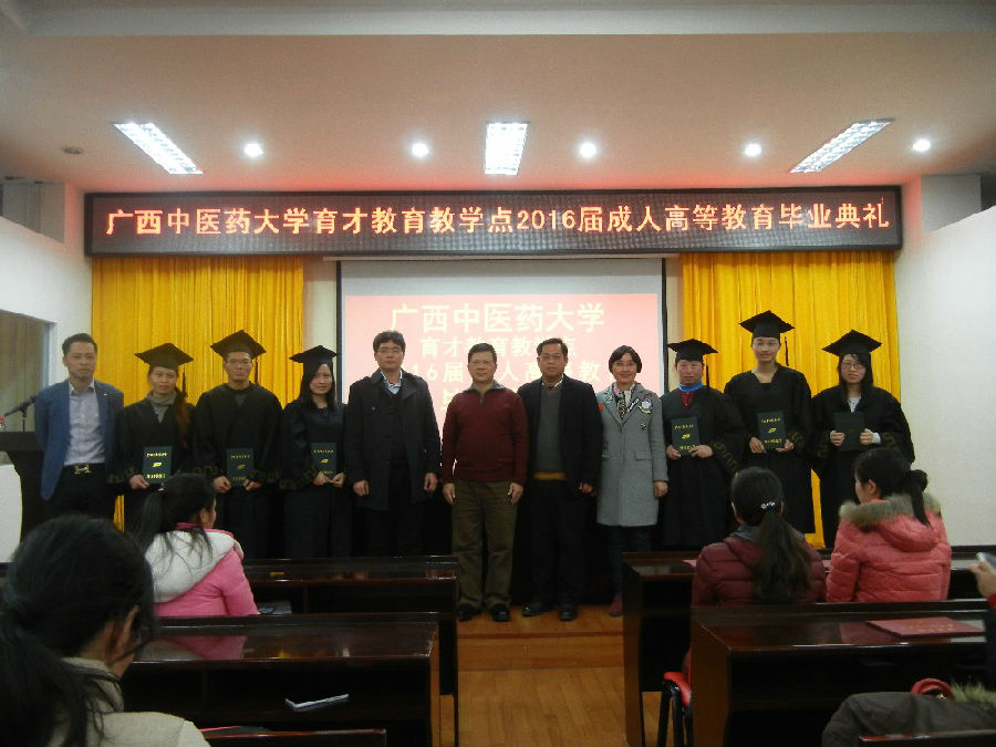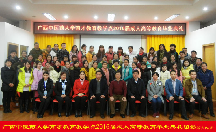 2016年1月23日下午15:00,廣西中醫(yī)藥大學(xué)育才教育教學(xué)點(diǎn)2016屆成人高等教育畢業(yè)典禮在柳州市中醫(yī)院隆重舉行。廣西中醫(yī)藥大學(xué)成教院韋艾凌院長(zhǎng)、黃瑞誠(chéng)副院長(zhǎng)、彭榮翠老師出席了畢業(yè)典禮,韋艾凌院長(zhǎng)發(fā)表重要講話。廣西育才教育集團(tuán)董事長(zhǎng)、廣西中醫(yī)藥大學(xué)育才教育教學(xué)點(diǎn)負(fù)責(zé)人蔣華老師,育才教育王志校長(zhǎng)以及來(lái)自柳州各大醫(yī)院、衛(wèi)生院、醫(yī)藥公司和藥店近200多名畢業(yè)生共同參加了畢業(yè)典禮。