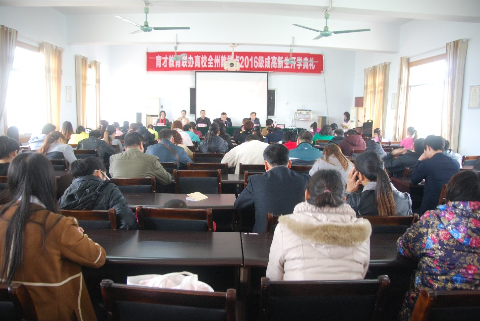 3月19日上午,育才教育全州縣教學(xué)點隆重舉行聯(lián)辦高校2016級成人高等教育新生開學(xué)典禮。廣西育才教育集團黨支部書記、董事長蔣華老師帶隊到全州教學(xué)點調(diào)研并出席開學(xué)典禮,育才教育蔣亮副校長、全州分校蔣欽軍校長、桂林分校韋洪歡主任、黃肖曼主任以及來自全州縣的100多名新生代表參加了開學(xué)典禮,典禮由蔣欽軍校長主持。