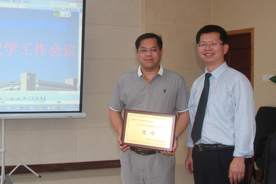 桂林醫(yī)學(xué)院成教院高東院長(zhǎng)給育才教育負(fù)責(zé)人蔣華頒發(fā)優(yōu)秀獎(jiǎng)牌