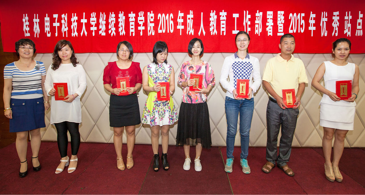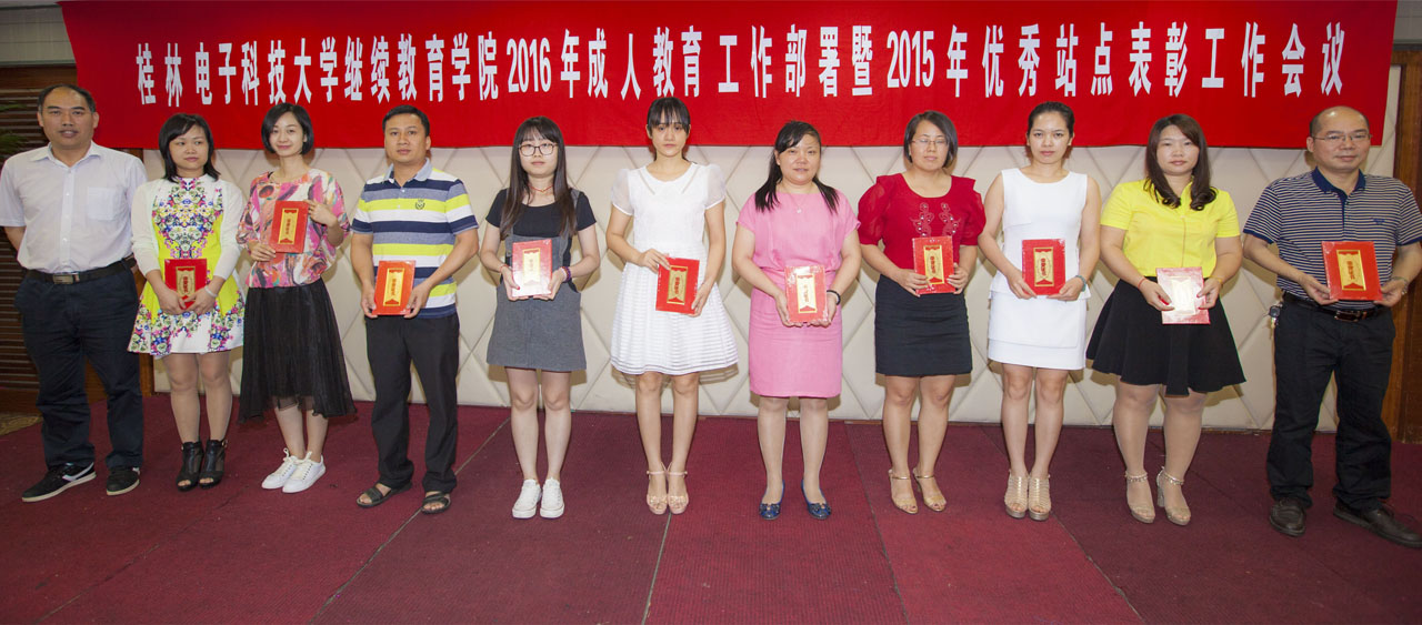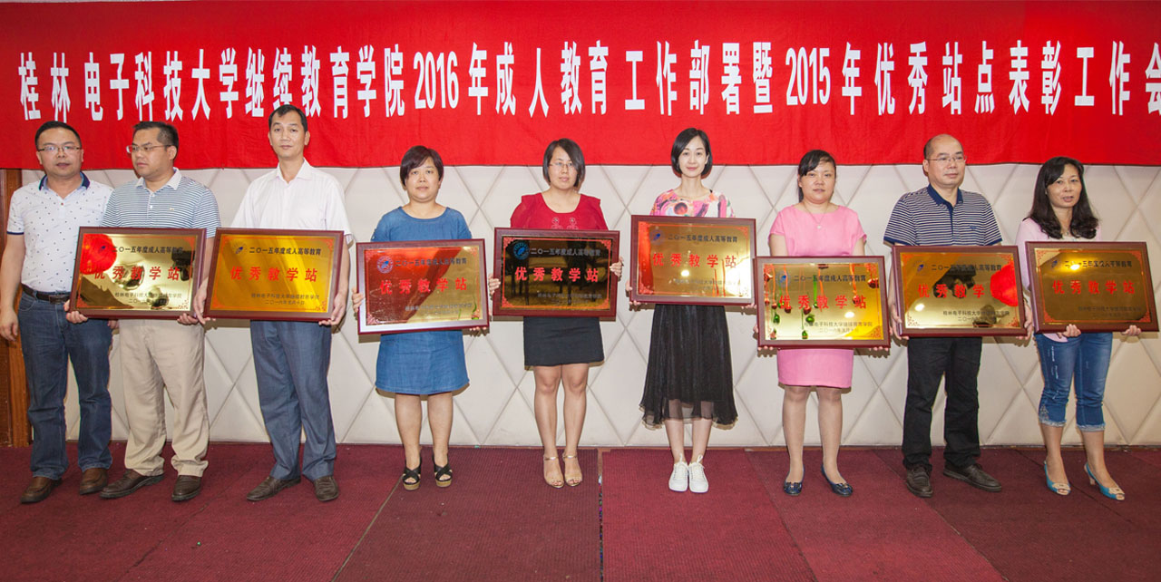 我站點(diǎn)通過(guò)全體職工努力,因招生突出和教學(xué)管理規(guī)范,榮獲了桂林電子科技大學(xué)2015年招生工作先進(jìn)單位和優(yōu)秀教學(xué)站。蔣亮副校長(zhǎng)、韋洪芳主任榮獲招生先進(jìn)個(gè)人,莫新紅主任榮獲教學(xué)管理先進(jìn)個(gè)人。