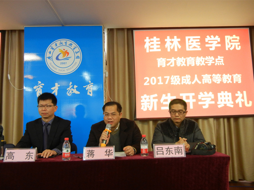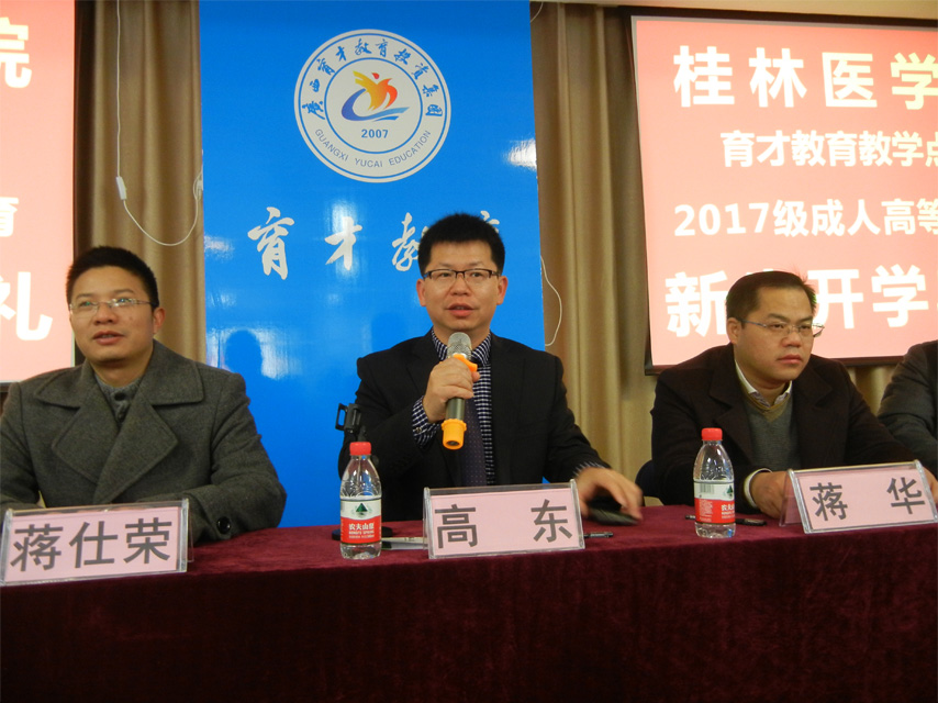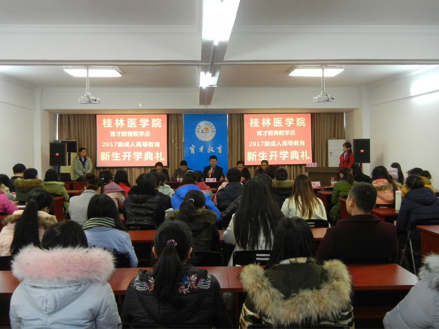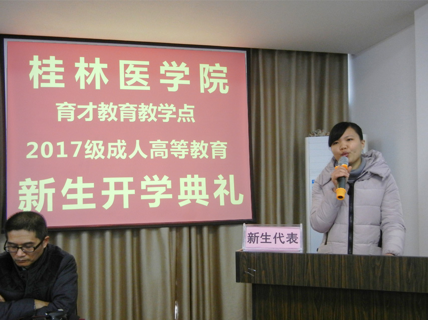 1月14日上午,桂林醫(yī)學(xué)院育才教育教學(xué)點(diǎn)2017級成人高等教育新生開學(xué)典禮在育才柳州總部四樓多媒體教室隆重舉行。桂林醫(yī)學(xué)院繼續(xù)教育學(xué)院高東院長、招生辦呂東南主任出席開學(xué)典禮,高東院長作重要講話。桂林醫(yī)學(xué)院柳州育才教學(xué)點(diǎn)負(fù)責(zé)人蔣華老師,育才醫(yī)學(xué)部部長蔣仕榮、育才教育校長王志以及來自柳州各大醫(yī)院、衛(wèi)生院、醫(yī)藥公司和藥店等100多名新生參加了開學(xué)典禮。典禮由育才學(xué)工辦主任陳韻先主持。