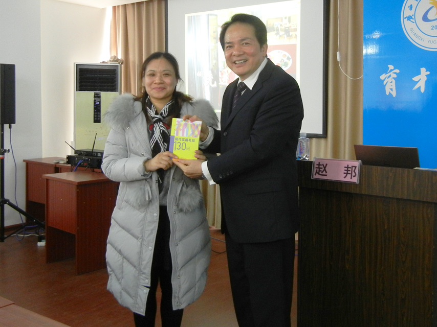 趙邦教授主編的《現(xiàn)代實(shí)用禮儀130問(wèn)》書(shū)籍,育才負(fù)責(zé)人蔣華和多位學(xué)員獲得趙邦教授現(xiàn)場(chǎng)簽名贈(zèng)書(shū)。