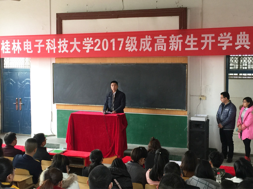 3月11日,桂林電子科技大學(xué)校本部2017級成人高等教育新生開學(xué)典禮在桂林市六合路123號桂電西校區(qū)勝利召開,繼續(xù)教育學(xué)院直屬黨支部書記劉燕軍、副院長向榮、院長助理李麗芳、學(xué)歷部主任張勇、辦公室主任程華、教師代表石會全、展領(lǐng)、廣西育才教育集團(tuán)黨支部書記、董事長蔣華出席典禮。典禮由繼續(xù)教育學(xué)院辦公室主任程華主持。