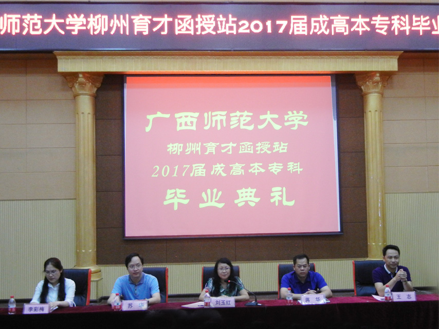 7月2日上午,廣西師范大學(xué)柳州育才函授站2017屆成高本專科畢業(yè)典禮暨學(xué)位授予儀式在育才柳州總部隆重舉行。廣西師范大學(xué)繼續(xù)教育學(xué)院院長、博士、教授劉玉紅、學(xué)歷部主任蘇華出席典禮,劉玉紅院長作重要講話。育才黨支部書記、董事長蔣華、柳州市育才教育培訓(xùn)中心校長王志、常務(wù)副校長李彩梅以及來自柳州市各區(qū)、縣的150多名畢業(yè)生代表參加了畢業(yè)典禮。