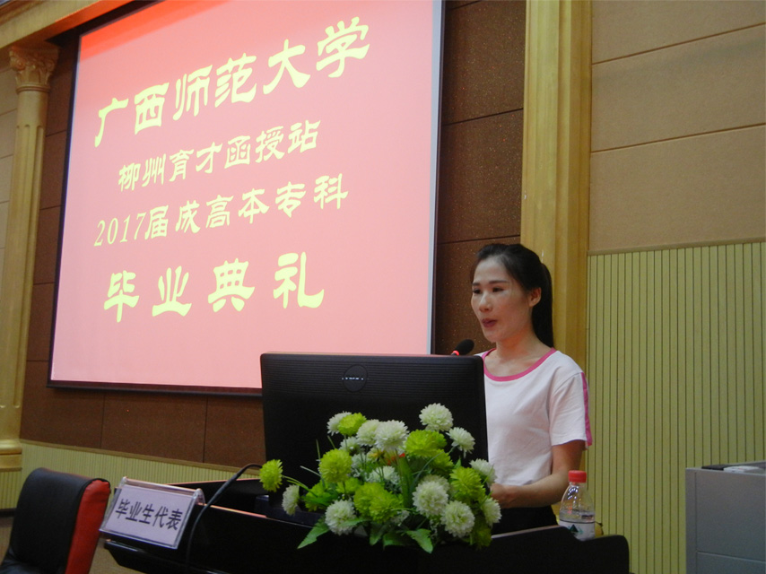 畢業(yè)典禮在莊嚴(yán)的國歌聲中拉開序幕。劉玉紅院長發(fā)表了熱情洋溢的講話,他首先代表學(xué)校向順利完成學(xué)業(yè)的畢業(yè)生們表示祝賀,勉勵畢業(yè)生在今后仍要保持一顆積極進(jìn)取的心,活到老學(xué)到老,學(xué)以致用,做生活的強(qiáng)者。2017年是廣西師范大學(xué)建校85周年,劉玉紅院長誠摯邀請畢業(yè)生回母校參加校慶活動。