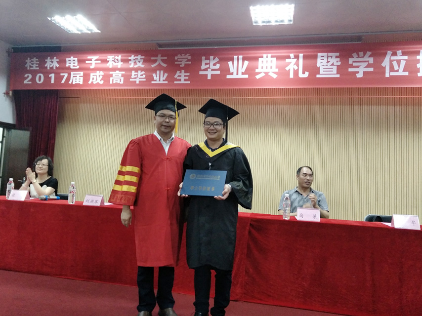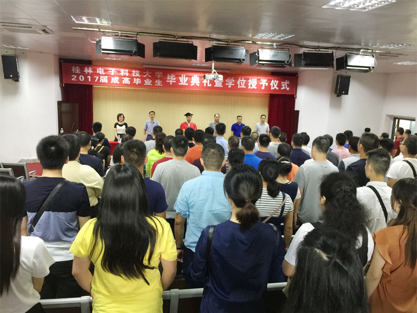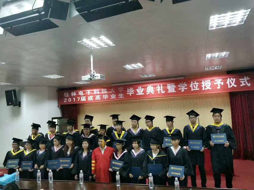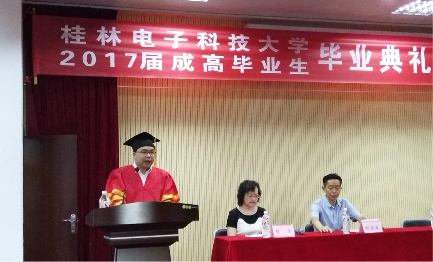 7月9日上午,桂林電子科技大學(xué)2017屆成高畢業(yè)生畢業(yè)典禮暨學(xué)位授予儀式在桂林電子科技大學(xué)東校區(qū)正平科技館一樓報告廳隆重舉行。繼續(xù)教育學(xué)院院長、博士、教授甘勇、副院長劉燕軍、向榮、院辦主任程華出席典禮,育才教育黨支部書記、董事長蔣華及近200名畢業(yè)生代表參加了典禮,典禮由學(xué)歷部主任張勇主持。
