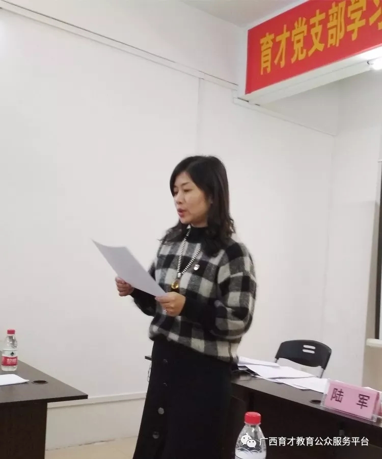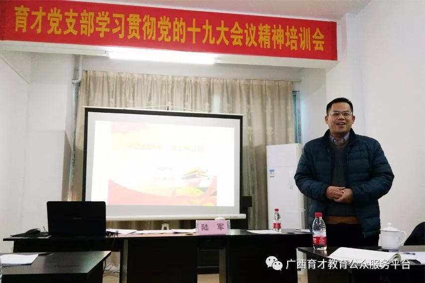 12月19日,柳州市育才教育培訓(xùn)中心黨支部學(xué)習(xí)貫徹黨的十九大會議精神培訓(xùn)會在育才柳州總部412多媒體教室舉行,培訓(xùn)會由柳州市委組織部社會組織科陸軍科長主講,柳州市魚峰區(qū)組織部副部長、兩新組織黨工委書記李群生參加培訓(xùn)會并作講話,培訓(xùn)會由育才蔣華書記主持。