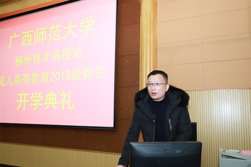 廣西育才教育黨支部書記、函授站站長蔣華老師對2018級新生入學表示熱烈的歡迎,他介紹了廣西育才教育、廣西師范大學柳州育才函授站的基本情況、辦學優(yōu)勢和近年所獲得的榮譽,同時向2018級新生們提出兩點希望:一是轉(zhuǎn)變學習觀念,處理好工學矛盾,做到工作、學習兩不誤;二是明確學習目的,端正學習態(tài)度,加強學習的自律性。蔣華老師表示,育才教育將會更好地搭建好學校和學員之間的橋梁,通過良好的學習環(huán)境、完善的教學管理和豐富多彩的學工活動等為學員們做好服務(wù),讓各位學員在這里學習好知識,擴展人脈資源和提高自身素質(zhì)。