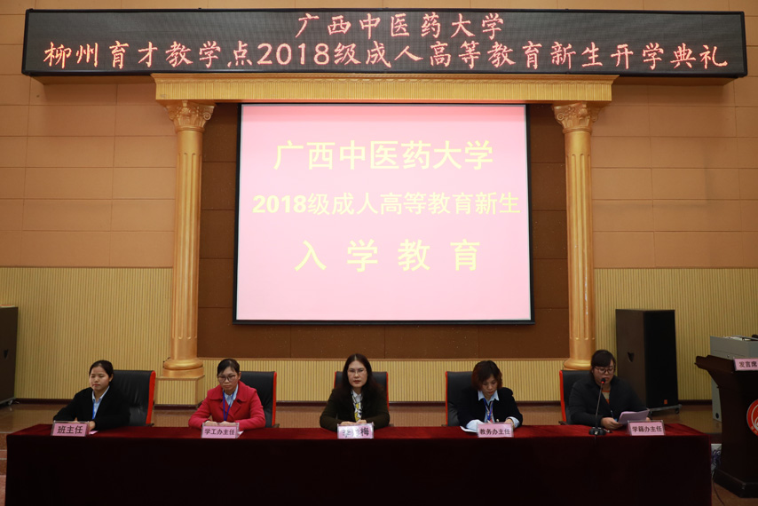 1月21日上午,廣西中醫(yī)藥大學(xué)育才教育校外輔導(dǎo)站2018級成人高等教育新生開學(xué)典禮在柳州總部順利召開。廣西中醫(yī)藥大學(xué)直屬黨委書記、成人繼續(xù)教育學(xué)院院長、博士生導(dǎo)師、二級教授韋艾凌、副院長黃瑞誠、院長助理、培訓(xùn)部主任楊繼峰、廣西育才教育黨支部書記、輔導(dǎo)站站長蔣華老師、育才教育校長王志以及來自柳州醫(yī)學(xué)行業(yè)的100多名新生代表參加了開學(xué)典禮。
