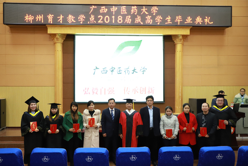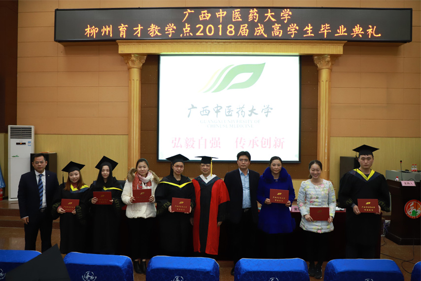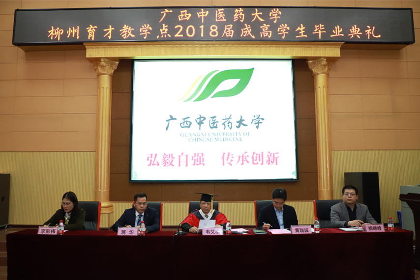 1月21日下午,廣西中醫(yī)藥大學(xué)育才教育校外輔導(dǎo)站2018屆成高學(xué)生畢業(yè)典禮暨學(xué)位授予儀式在柳州總部隆重舉行。廣西中醫(yī)藥大學(xué)直屬黨委書(shū)記、成人繼續(xù)教育學(xué)院院長(zhǎng)、博士生導(dǎo)師、二級(jí)教授韋艾凌、副院長(zhǎng)黃瑞誠(chéng)、院長(zhǎng)助理、培訓(xùn)部主任楊繼峰出席了畢業(yè)典禮,廣西育才教育黨支部書(shū)記、輔導(dǎo)站站長(zhǎng)蔣華老師、育才教育常務(wù)副校長(zhǎng)李彩梅以及來(lái)自柳州醫(yī)學(xué)行業(yè)的100多名專本科畢業(yè)生代表參加了畢業(yè)典禮。