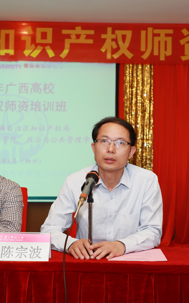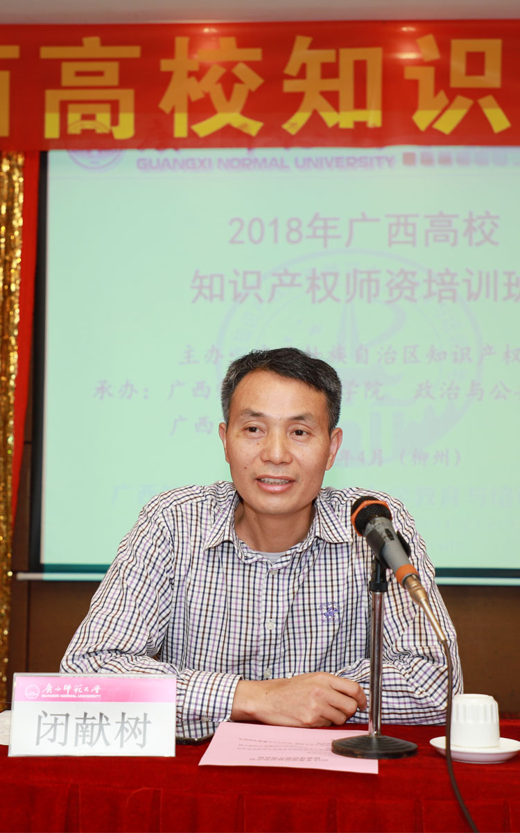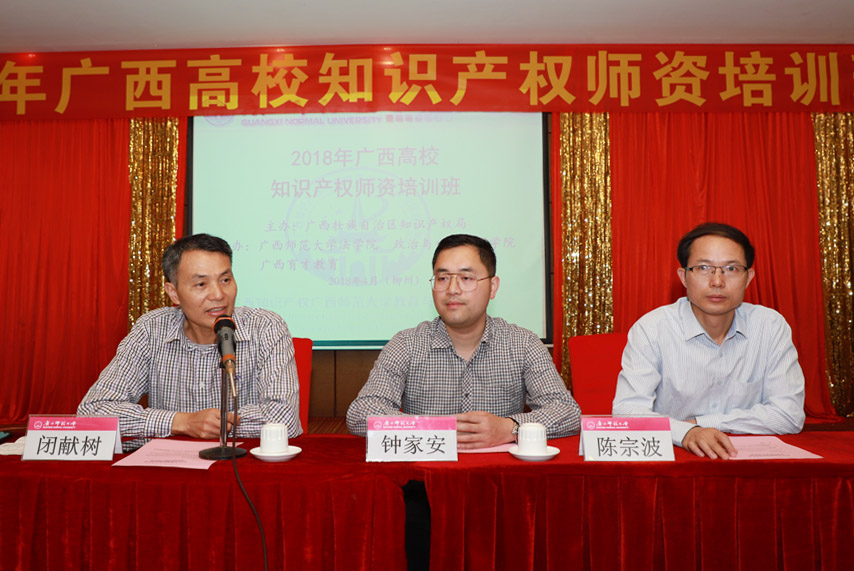 廣西知識(shí)產(chǎn)權(quán)局綜合處副調(diào)研員鐘家安、廣西師范大學(xué)科技處副處長(zhǎng)畢獻(xiàn)樹、法學(xué)院院長(zhǎng)、政治與公共管理學(xué)院院長(zhǎng)、律師學(xué)院院長(zhǎng)、中國(guó)--東盟青年社會(huì)組織發(fā)展研究院院長(zhǎng)陳宗波博士、教授出席培訓(xùn)活動(dòng)并就如何貫徹黨的十九大精神、加快知識(shí)產(chǎn)權(quán)強(qiáng)國(guó)建設(shè)、積極響應(yīng)國(guó)家雙創(chuàng)教育政策和提升廣西大學(xué)生創(chuàng)新創(chuàng)業(yè)人才培育的師資需求等進(jìn)行發(fā)言。