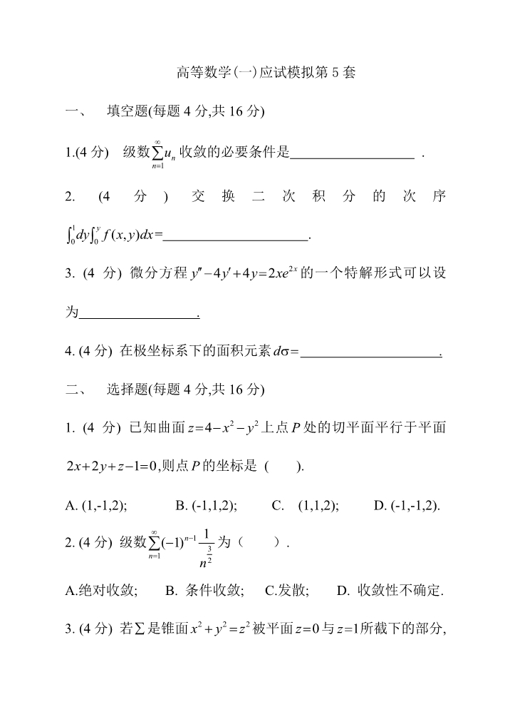 成人高考專升本高等數(shù)學(一)模擬試題五